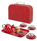 Tea time with red polka dots - now that really hits the spot! Sized just right for little hands, this quaintly miniaturized 15-piece set includes lidded teapot, four plates, four cups and saucers and a serving tray. Everything packs neatly into a cute suitcase-style carrying case for tea parties at Grandma's or a friend's house. For ages 3 and up. Size: Serving tray 10"L x 4"W. Read more
